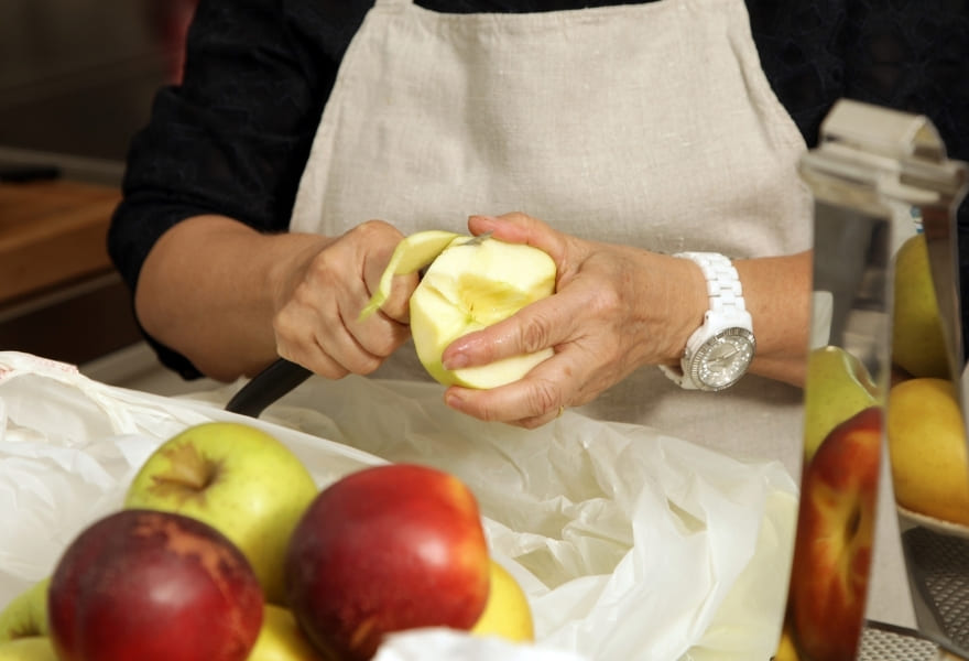 3. Epluchez les pommes, ôtez les pépins, et coupez-les en deux.